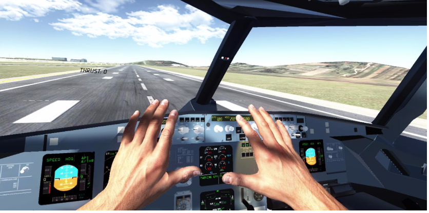 Στην παρούσα διπλωματική υλοποιήθηκε ένας πλήρης εξομοιωτής πτήσης, αξιοποιώντας την τελευταία λέξη της τεχνολογίας πάνω στους τομείς της εικονικής πραγματικότητας και της τεχνολογίας αναγνώρισης κίνησης χεριού. Συγκεκριμένα, ο χρήστης-πιλότος, έχει τη δυνατότητα προσομοίωσης μιας αληθινής πτήσης μέσα από το πιλοτήριο ενός εκ των πιο διάσημων επιβατικών αεροσκαφών, στον εναέριο χώρο του Ελ. Βενιζέλος και γενικότερα των Αθηνών. Επιπλέον, ο χρήστης μπορεί να αλληλεπιδράσει σε πραγματικό χρόνο με το πιλοτήριο με τα ίδια του τα χέρια, αυξάνοντας έτσι το επίπεδο ρεαλισμού και την εμβύθιση του στο εικονικό περιβάλλον. Τέλος ο χρήστης λαμβάνει ανάδραση αφής στο χέρι του κατόπιν αγγίγματος κουμπιών, διακοπτών του πιλοτηρίου.